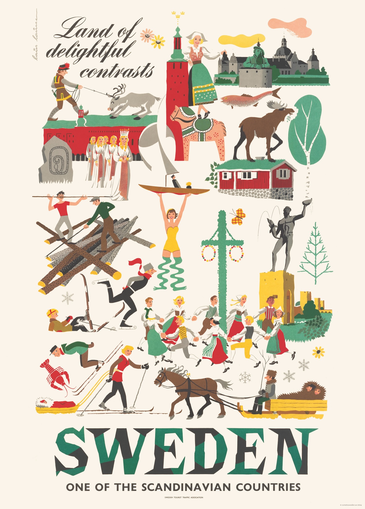 In this vintage travel poster advertising Sweden the message is clear: Sweden is truly a country of colors AND contrasts. It was published in the 1950s in an effort to create a Scandinavian series of almost identical travel posters for Denmark, Sweden and (most probably) also Norway. As you can see in the poster: people just are so happy whatever they do in Sweden: folk dancing, sailing, skating. Even working is just so easy over here! So get into the mood and decorate your home with this classic feel good vintage poster.